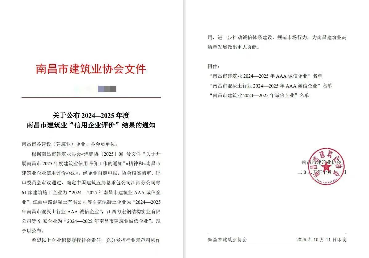 工程公司获评“2024-2025年度南昌市建筑业诚信企业”