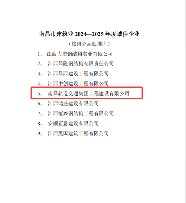 南昌轨道工程公司凭借良好的企业信誉和过硬的项目质量,在南昌市建筑业诚信企业评选中脱颖而出,荣膺“2024-2025年度南昌市建筑业诚信企业”称号。